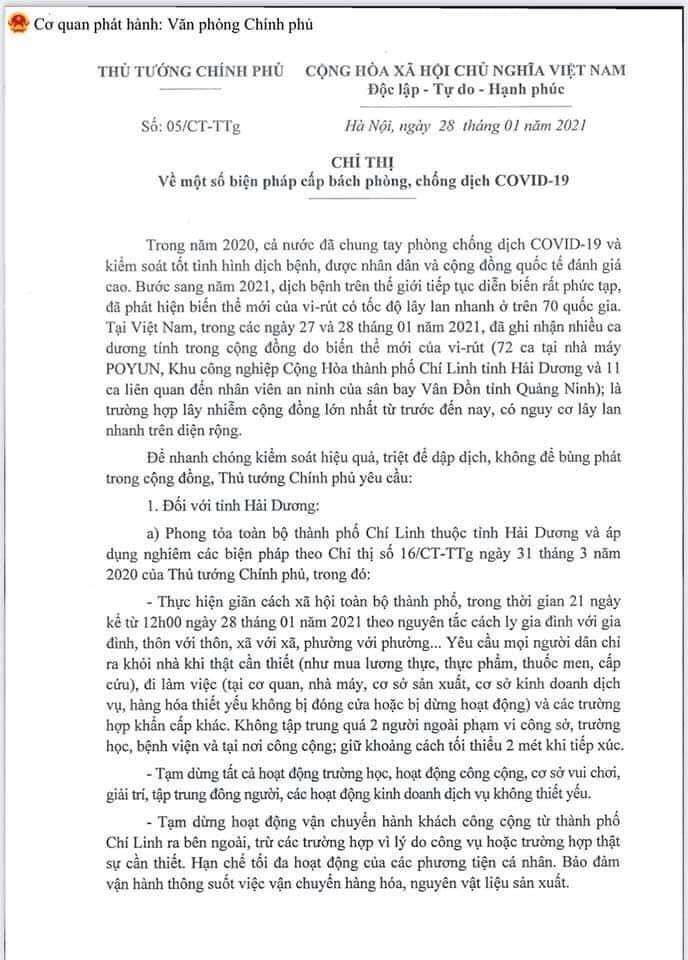 Chỉ thị 05 của Thủ tướng về phòng chống dịch Covid 19